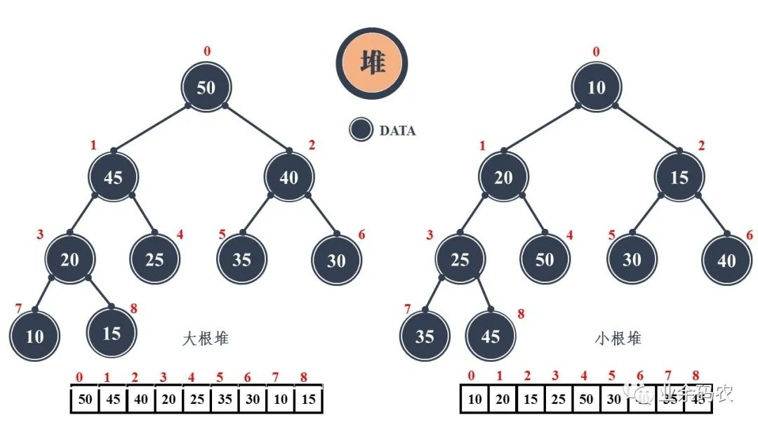 了解完二叉樹,再來理解堆就不是什么難事了。堆通常是一個可以被看做一棵樹的數組對象。堆的具體實現一般不通過指針域,而是通過構建一個一維數組與二叉樹的父子結點進行對應,因此堆總是一顆完全二叉樹。