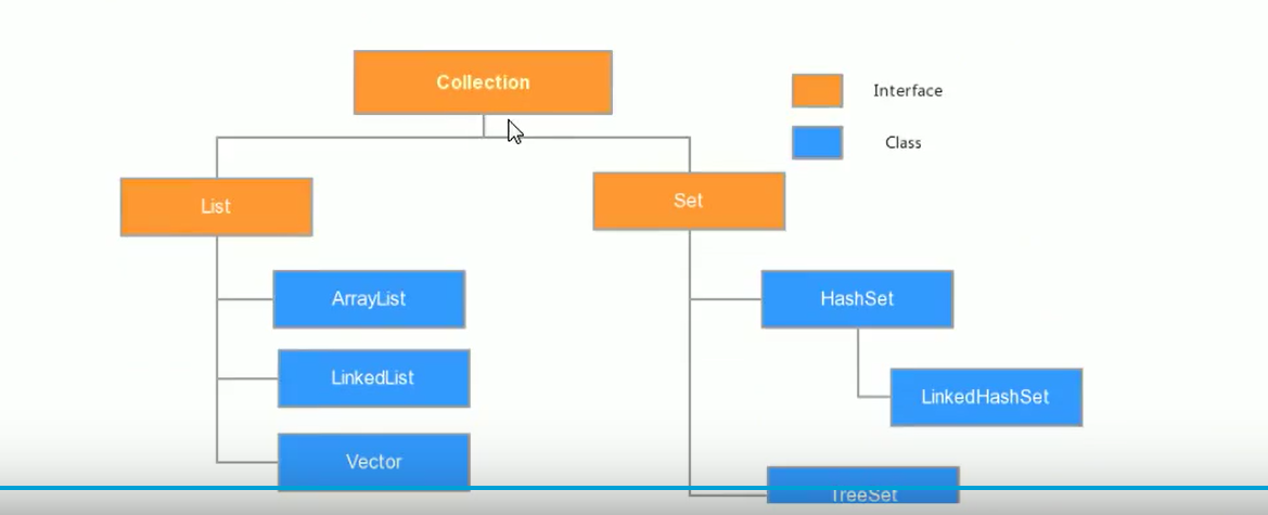 其中,橙色框里填寫的都是接口類型,而藍色框里填寫的都是具體的實現類。這幾天將針對圖中所列舉 的集合類進行逐一地講解。