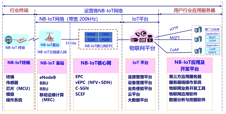 NBIOT物聯網網絡架構如下圖所示,由NBIOT終端組成的各種傳感采集設備,依據功能需求采集需要被感知的量,一般終端設備由傳感器、芯片、模組以及軟件方面的操作系統組成,通過NBIOT基站將被采集到的數據發送到NBIOT核心網,然后核心網將數據發送到物聯網管理平臺,通過行業服務器管理終端設備。此過程數據鏈路通過特定的協議實現數據的雙向數據交互。