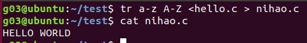 操作過程:我們利用tr命令識別hello.c中的文本,并通過字符串修改寫入到nihao.c中: