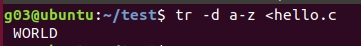 通過圖片,我們可以看到,原hello.c文本為:“hello WORLD”,通過tr命令,我們可以將小寫的“hello”刪除,剩下大寫字符“WORLD”。