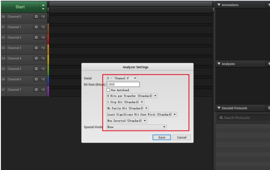 設置采樣速率:通常串口通信的速率(波特率)在一定范圍內,確保邏輯分析儀的采樣率足夠高,以捕獲所需的波形細節。