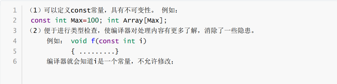 3. 增(zeng)強(qiang)代碼(ma)的(de)可(ke)讀性和安全性:使(shi)用(yong)const可(ke)以使(shi)代碼(ma)更加清(qing)晰(xi),減少因誤(wu)修(xiu)改共(gong)享(xiang)資源而引起的(de)錯誤(wu)。