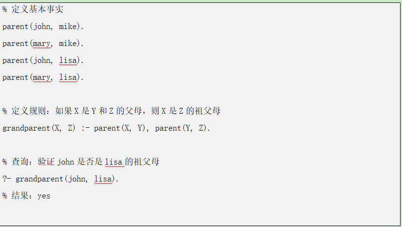 在這個例(li)子中,我(wo)們首(shou)先定(ding)義了一些基本的(de)家(jia)庭關(guan)系作為事實。接著,我(wo)們定(ding)義了一個規(gui)則(ze)grandparent/2,用來判斷(duan)一個人是否是另(ling)一個人的(de)祖父母。通(tong)過(guo)查(cha)詢grandparent(john, lisa),Prolog能夠自動推斷(duan)出john是lisa的(de)祖父母。