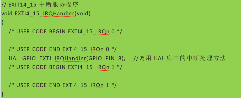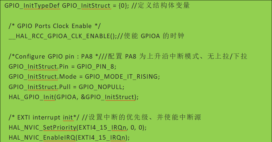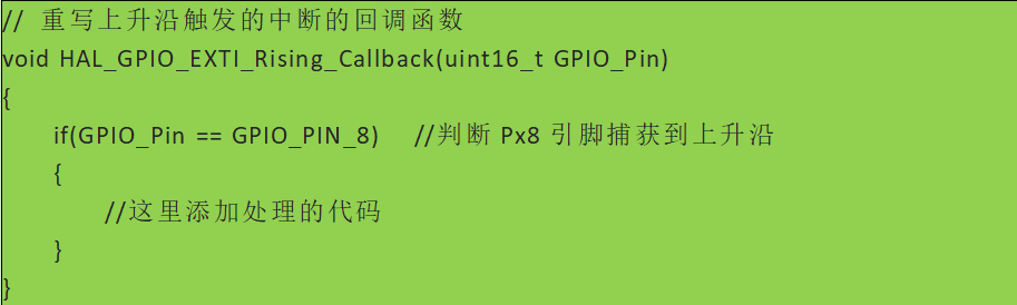 在EXIT中(zhong)斷(duan)模式下,在中(zhong)斷(duan)觸(chu)發(fa)時系統會自動調用中(zhong)斷(duan)服(fu)務程序。中(zhong)斷(duan)服(fu)務程序中(zhong)會默認使用HAL庫(ku)的(de)API去處理(li)中(zhong)斷(duan)。為了讓(rang)開發(fa)人員能自定義處理(li)功能,在HAL中(zhong)留出允許開發(fa)人員重寫(xie)的(de)回(hui)調函數API。以(yi)下是一(yi)個對(dui)應PA8引腳(jiao)的(de)上(shang)升沿中(zhong)斷(duan)模式開發(fa)代碼: