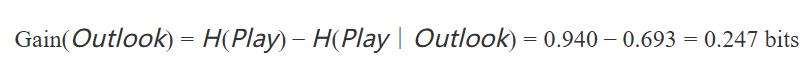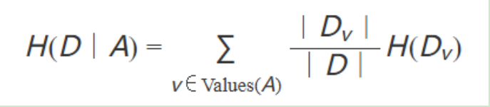 其中,H(D∣A)是(shi)在特(te)征 A 的(de)條(tiao)件(jian)下(xia)的(de)條(tiao)件(jian)熵,Values(A)是(shi)特(te)征 A 的(de)所(suo)有取(qu)值,DvDv是(shi) 在特(te)征 A的(de)取(qu)值 v上(shang)的(de)數(shu)據子集,∣Dv∣和(he) ∣D∣分(fen)別是(shi)數(shu)據子集 Dv和(he)數(shu)據集 D的(de)大 小。