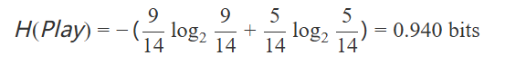 首先,我們計算整個數據集(ji)的信息熵(原(yuan)始(shi)狀態的信息量):數據集(ji)包(bao)含14個實例,其中9個正例(yes)和(he)5個負例(no)。