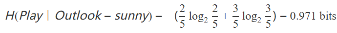 1. 對于Outlook=sunny,有5個實(shi)例,其中2個正(zheng)例和(he)3個負例: