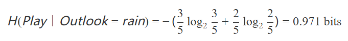 3. 對(dui)于(yu)Outlook=rain,有5個(ge)實例,其中3個(ge)正例和2個(ge)負例: