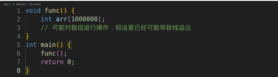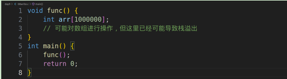 在(zai)這個例子(zi)中(zhong),func函數中(zhong)定義的arr數組如果太大,超出了棧的容量,就會引(yin)發(fa)棧溢出。棧的大小在(zai)系統(tong)中(zhong)是(shi)有限制的,一般(ban)由(you)操作系統(tong)和(he)編譯時(shi)的設置決定。