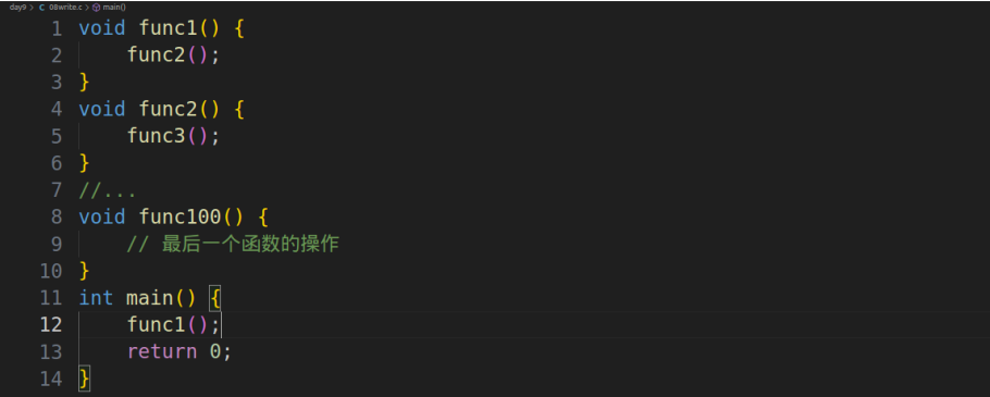在這個代碼(ma)中,從func1到func100層層嵌(qian)套調用,可能會因為棧幀的過度積累而(er)導致棧溢出。