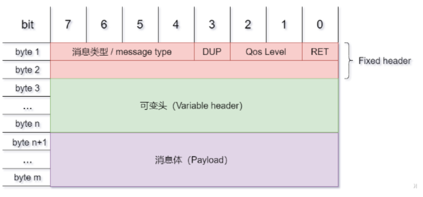 固定頭(Fixed header),存在(zai)于所有 MQTT 數據(ju)(ju)包中,表示數據(ju)(ju)包類型及數據(ju)(ju)包的(de)分組類標識;