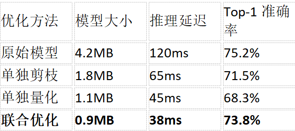 以(yi)MobileNetV3在ARM Cortex-M4芯片(pian)上的部署(shu)為例,聯合優(you)化框架(jia)可實現以(yi)下效(xiao)果(guo):