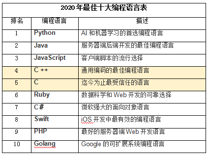 面對計算機行業的豐富的開發語言和日新月異的發展情況,剛進入行的學者最先要解決的問題是從哪個編程語言開始?根據2020年最新調查顯示,10大最佳編程語言中排名第4:C++-通用編碼的最佳編程語言,排名第5:C語言-迄今為止最受信任的語言。