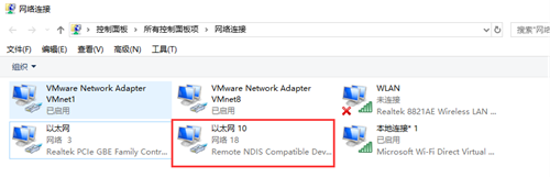 打開控制面板的網絡連接界面,在使用USBmini線連接開發板和PC后可以在網絡連接界面可看到多了一個Remote NDIS網卡,如下圖。