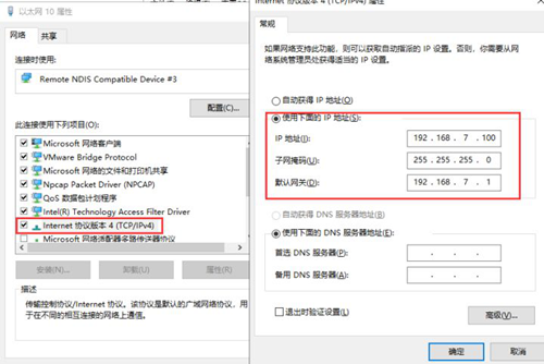 選中Remot NDIS網卡,右鍵選擇屬性,配置IPv4,選中后點擊屬性,配置IP地址為192.168.7.100,如下圖。