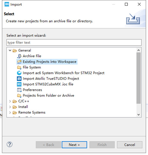 點擊File->Import…,選擇Existing Projects into Workspace,點擊NEXT。