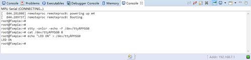 在一個ttyRPMSG0通道上發送消息”LED ON”或”LED OFF”可控制開發板上LED燈點滅狀態,并在同一ttyRPMSG0通道上同時接收回顯