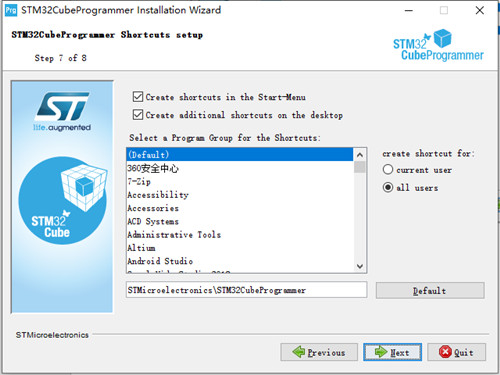 切換到“STM32CubeProgrammer”界面后點擊“Next”,創建桌面快捷鍵。