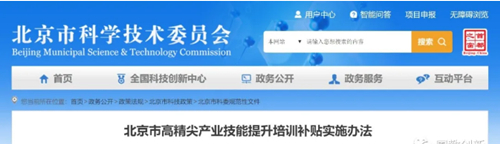 2020年3月9日,北京市科技委員會、北京市經濟和信息化局、北京市人力資源和社保局、北京市財政局聯合印發《北京市高尖產業技能提升培訓補貼實施辦法》(京科發[2020]3號)。