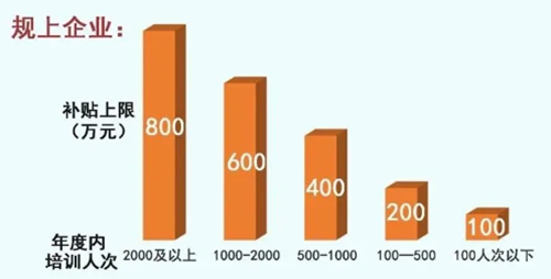 根據企(qi)業(ye)規模和(he)年度(du)內(nei)訓人次分檔、限額進行(xing)補貼。企(qi)業(ye)組織(zhi)職工開展技能提(ti)升培訓且績效(xiao)考核合格的,按照每人合計(ji)不(bu)超過2萬元的標準、不(bu)超過培訓總費用50%的比例,給(gei)予(yu)企(qi)業(ye)補貼。