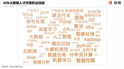 獵聘大數(shu)據(ju)(ju)研究院分(fen)析了AI 與大數(shu)據(ju)(ju)人才所應掌握(wo)的相關技能(neng)關鍵(jian)詞,結果發現(xian),這(zhe)個領域(yu)對人才素(su)質的要求較為綜合(he),不但要求相關的硬核(he)技能(neng),如人工智(zhi)能(neng)、算法、互聯網方面的知識和技能(neng),還要求懂得產(chan)品相關的知識儲備(bei)、數(shu)據(ju)(ju)分(fen)析、邏輯分(fen)析和市(shi)場營銷等技能(neng)。