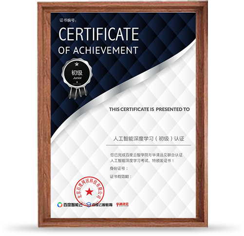 百度(du)是(shi)國內較早進入(ru)人(ren)工智能(neng)(neng)領域的企業,華(hua)(hua)清(qing)遠見是(shi)百度(du)云(yun)智學(xue)院授權認(ren)證合作(zuo)伙伴。《人(ren)工智能(neng)(neng)深度(du)學(xue)習(xi)(初級)認(ren)證》是(shi)百度(du)云(yun)智學(xue)院與華(hua)(hua)清(qing)遠見聯合打造(zao)的深度(du)學(xue)習(xi)人(ren)才培養(yang)與認(ren)證體(ti)系。完成華(hua)(hua)清(qing)遠見人(ren)工智能(neng)(neng)體(ti)系課程學(xue)習(xi)并(bing)考試通過,可獲(huo)得由(you)百度(du)云(yun)智學(xue)院頒發的高含金量(liang)《人(ren)工智能(neng)(neng)深度(du)學(xue)習(xi)(初級)認(ren)證證書》。