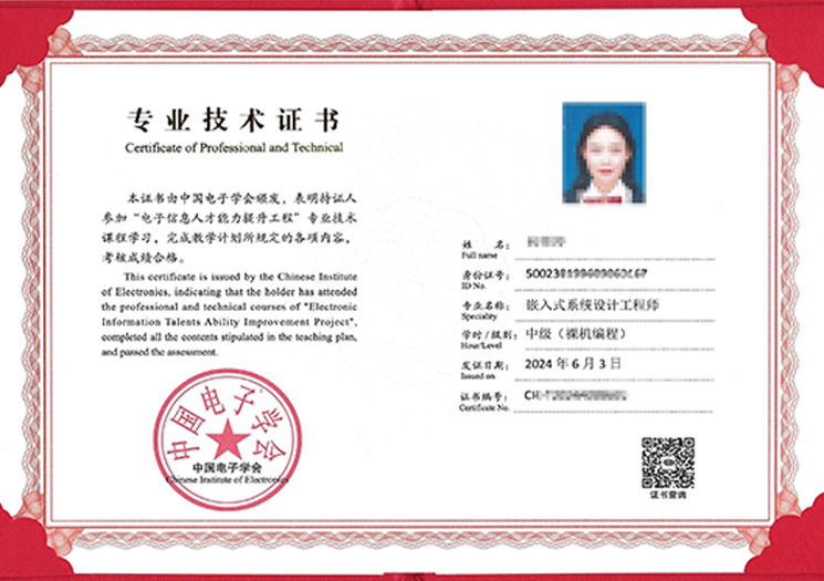 中國(guo)電子(zi)學(xue)會是(shi)國(guo)內中國(guo)電子(zi)信息領(ling)域權威的(de)學(xue)術機構(gou),總(zong)部是(shi)工(gong)業(ye)和(he)信息化部直(zhi)屬事業(ye)單位,成(cheng)立于1962年。學(xue)會集合了電子(zi)信息前沿領(ling)域豐富(fu)的(de)智庫資源,是(shi)實(shi)現(xian)中國(guo)工(gong)程師(shi)資格國(guo)際(ji)互認的(de)通道,是(shi)人社部第六批國(guo)家級專業(ye)技術人員繼續教(jiao)育(yu)基地(di)。 嵌(qian)入式技(ji)術專業人(ren)才(cai)認證(zheng)是針對嵌(qian)入式技(ji)術人(ren)才(cai)能力標準(zhun)化、系統(tong)化評(ping)估(gu)考核而(er)推出(chu),不僅(jin)可為(wei)用(yong)人(ren)單(dan)位(wei)提供(gong)專業人(ren)才(cai)技(ji)能評(ping)估(gu)參考, 還可供(gong)高(gao)校學生或(huo)嵌(qian)入式領(ling)域(yu)工作的人(ren)員自我評(ping)估(gu)。該認證(zheng)項目是由中(zhong)國(guo)(guo)電(dian)子(zi)學會(國(guo)(guo)內中(zhong)國(guo)(guo)電(dian)子(zi)信息領(ling)域(yu)權威(wei)的學術機(ji)構)發起,認證(zheng)考試合格后(hou),將由中(zhong)國(guo)(guo)電(dian)子(zi)學會指導并頒發《嵌(qian)入式系統(tong)設(she)計工程師》專業技(ji)術證(zheng)書。相關鏈接