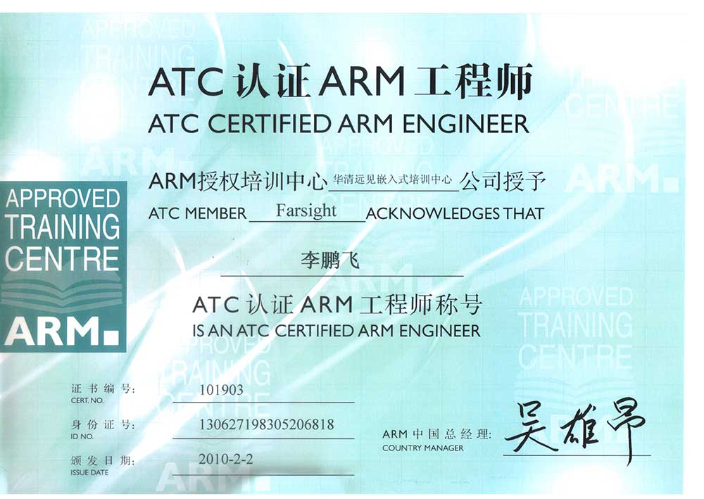 華(hua)清遠見是首家Atmel公(gong)司(si)(si)全球戰(zhan)(zhan)略(lve)合作(zuo)伙伴。Atmel公(gong)司(si)(si)已經投入專項(xiang)資金支持(chi)華(hua)清遠見建立(li)基(ji)于Atmel系列開發板的開放(fang)實(shi)驗室,會有更多學生借(jie)助(zhu)Atmel提供的專業、配(pei)套的軟、硬(ying)件環境及(ji)培訓課(ke)件高效(xiao)體(ti)驗Atmel系列案例的實(shi)戰(zhan)(zhan)過(guo)程并獲得Atmel公(gong)司(si)(si)頒發的《Atmel嵌入式工程師(shi)認(ren)證(zheng)證(zheng)書(shu)》,目前培訓機構中,只(zhi)有華(hua)清遠見能夠組織對(dui)應的Atmel認(ren)證(zheng)考試(shi)并頒發證(zheng)書(shu)。NXP嵌(qian)入式工程師認(ren)證(zheng)證(zheng)書樣本